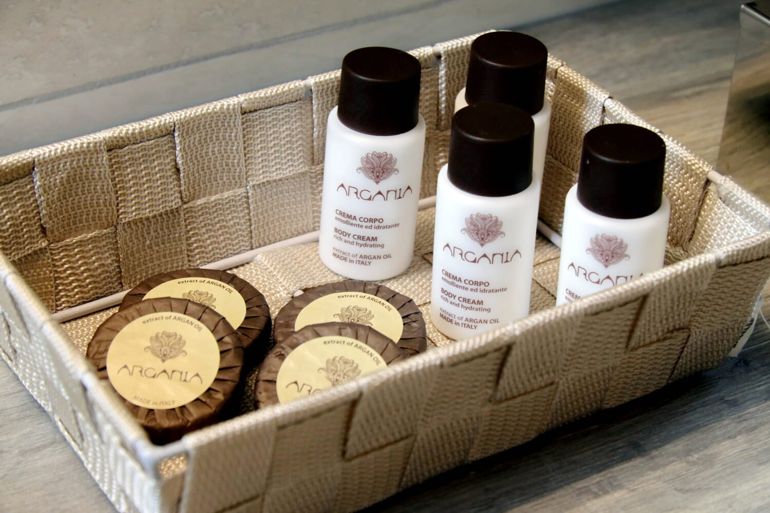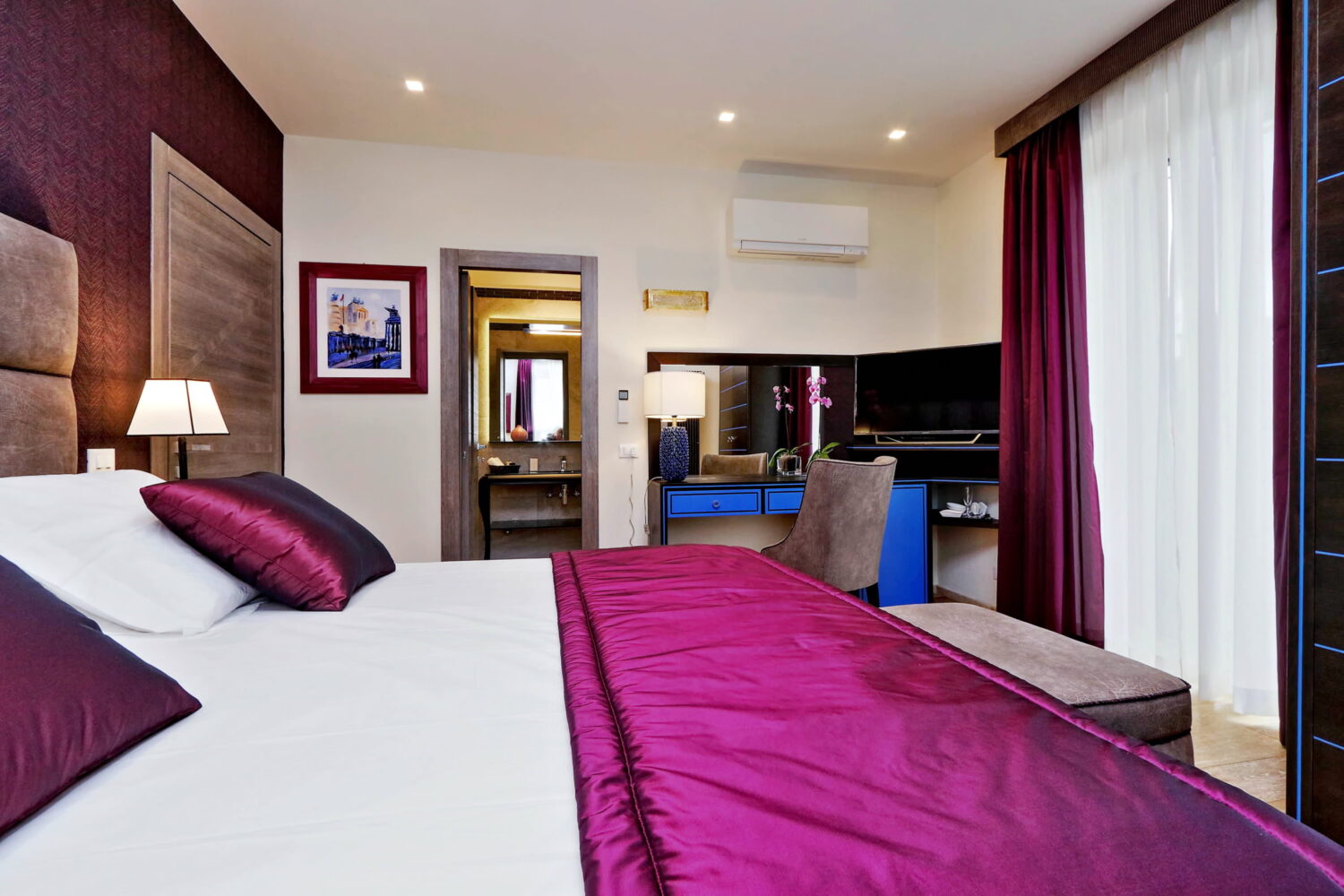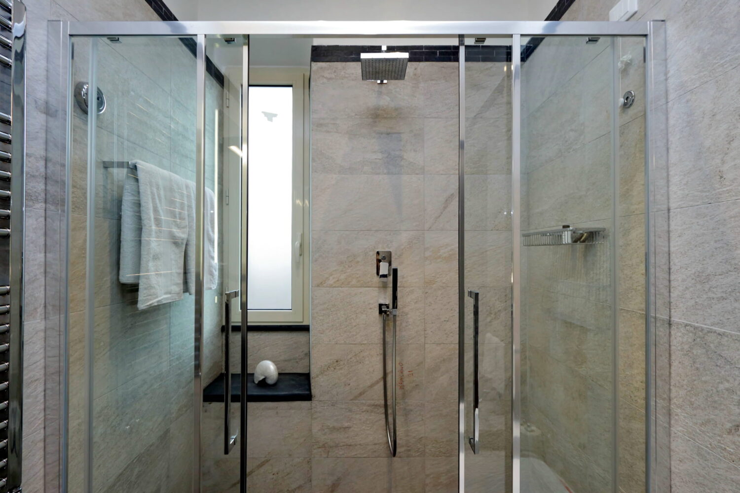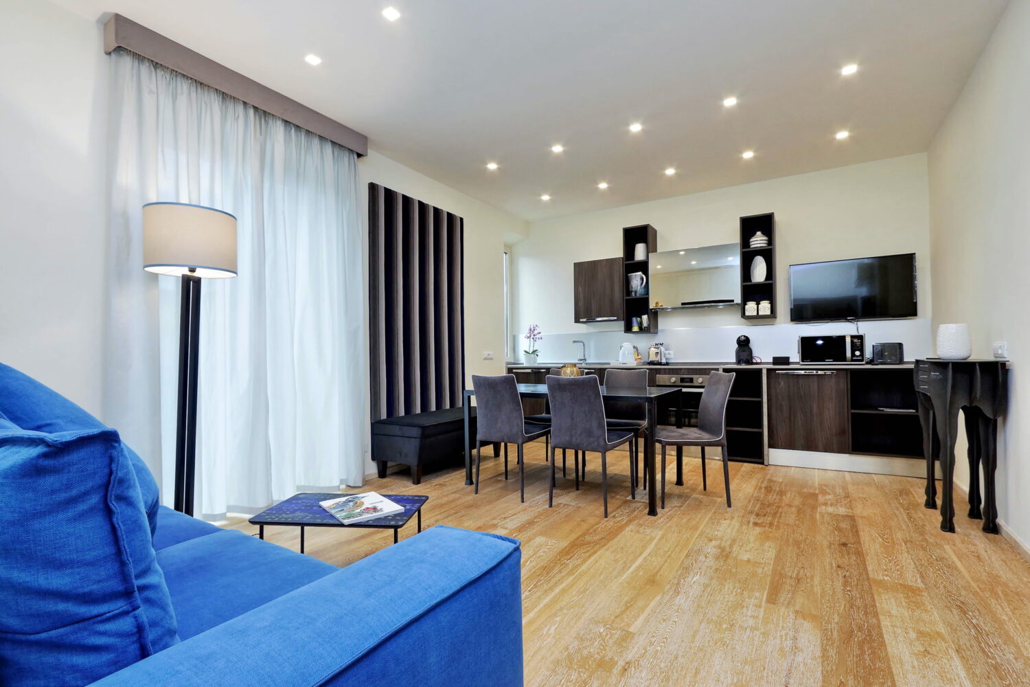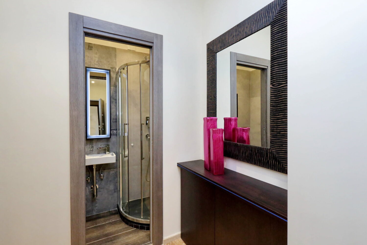 The apartment develops from the entrance immediately to the left with the first bedroom perfectly furnished with a double bed (180x200cm), two bedside tables, a large wardrobe with a safe, a suitcase stand, an ironing board with iron, a desk with armchair, a bed bench, a large console with 42″ Smart TV and internal fridge. The windowed bathroom is composed of a large wash-basin, a toilet, a bidet, a walk-in shower, a hair dryer and a small laundry rack. Continuing from the entrance, immediately to the right, there is a spacious living room with an elegant open kitchen equipped with a large sink, refrigerator, induction hob, oven, kettle, microwave, coffee machine with pods, toaster; the kitchen is provided with cutlery, plates, pots and pans. In the living room there is a dining table and chairs for 6 persons, a little sofa, a double sofa bed (160x190cm) with two small tables, magazine rack, cupboard and a Smart TV 48″; adjacent is a bathroom with a small wash-basin, toilet and shower. At the end of the living room to the right, is the second bedroom with a double bed (180x200cm), two bedside tables, a large wardrobe with a safe, suitcase stand, iron and ironing board. At the side of the bed, with bed bench, there is a desk with an armchair, a large wall console, a fridge, a 42” Smart TV; the private bathroom is composed of a wash-basin, toilet, bidet, large walk-in shower, equipped with a hair dryer and a clothes line for small hand wash laundry.